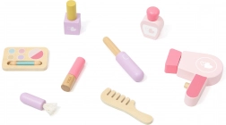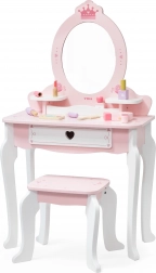 Praktična ladica i bočne police sakrit će sve male dragocjenosti. U kompletu je bogat set drvenih dodataka: paleta s kistom, ruž, lakovi za nokte, parfem, češalj, mekani kist za puder i sušilo. Igračku krase glatki rubovi i površina tretirana netoksičnim bojama za sigurnu igru.