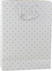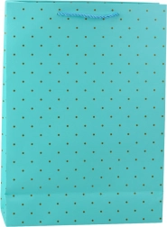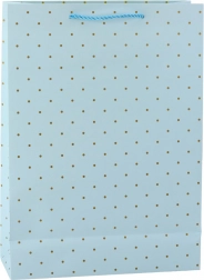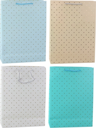 Stilski poklon vrećica sa suptilnim uzorkom zlatnih točkica idealno je rješenje za one koji preferiraju klasiku, jednostavnost i eleganciju. Zahvaljujući svom univerzalnom a ujedno i suptilnom dizajnu, izvrstan je izbor kako za formalne tako i za osobne prilike. Vrećica je dostupna u četiri pastelne, prigušene nijanse – svijetloplavoj, bež, bijeloj i tirkiznoj – koje se lako prilagođavaju prigodi, tipu poklona ili osobi kojoj je namijenjena. Zlatni, sjajni tisak u obliku točkica daje cijeloj cjelini uzvišen karakter i elegantni je dodatak jednostavnoj pozadini.