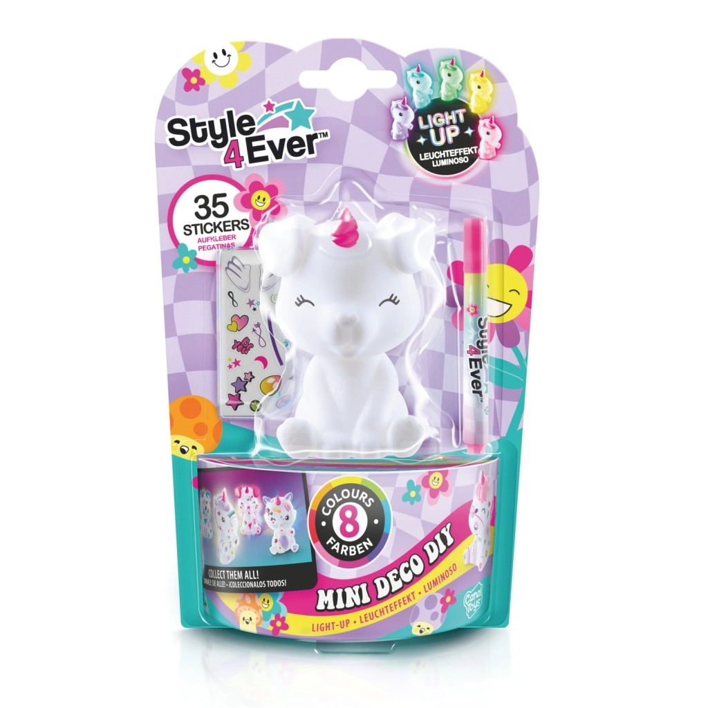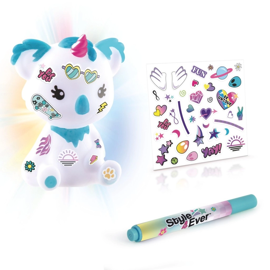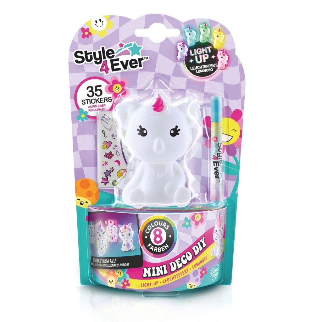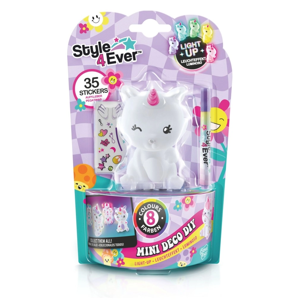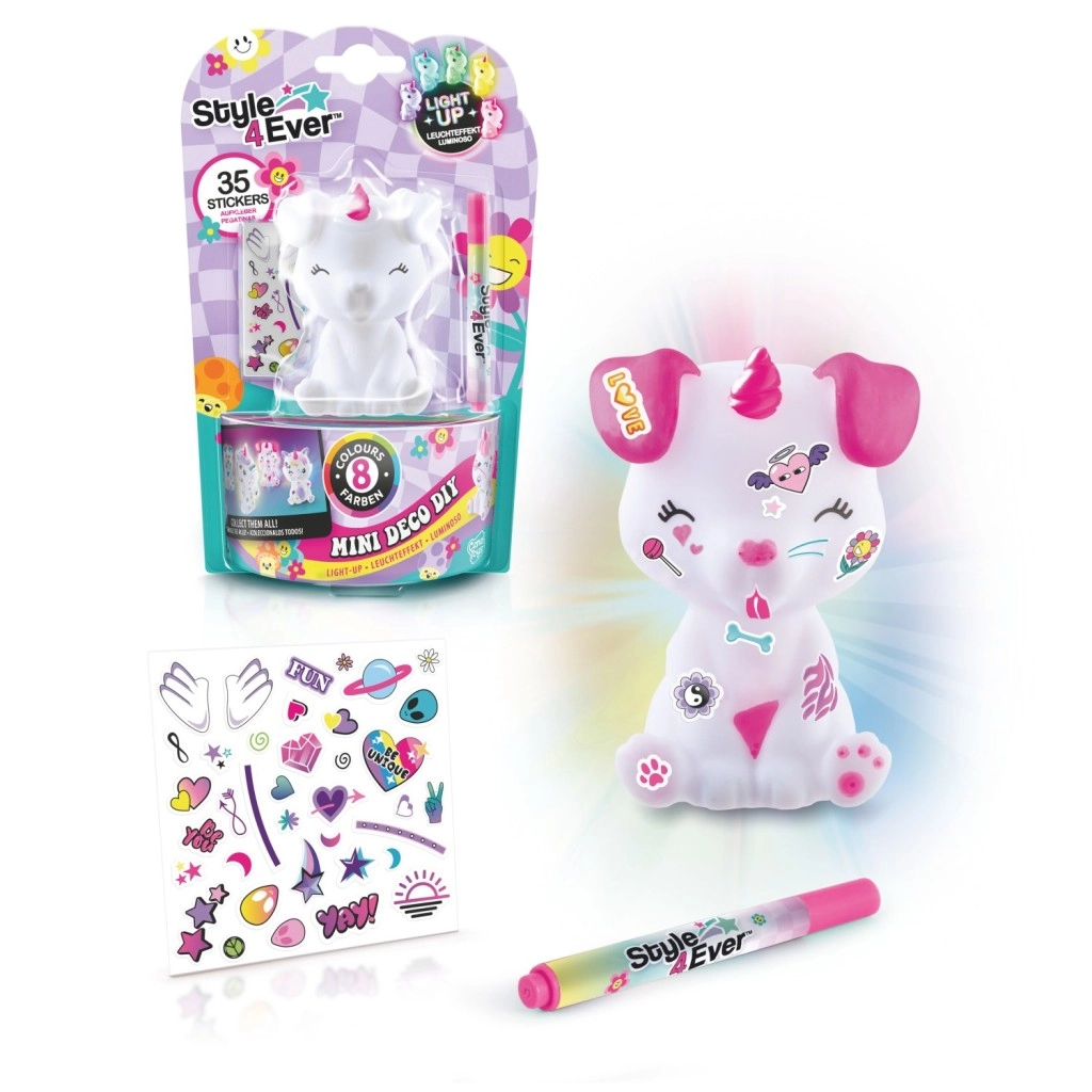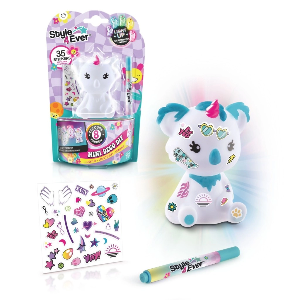 Osvijetlite sobu originalnom dekoracijom: svjetleća figurica STYLE4EVER mini deco donosi nježno ambijentalno svjetlo u 8 boja i prostor za kreativno ukrašavanje. U pakiranju se nalaze naljepnice i flomaster, a možete birati između 6 motiva (2 jednoroga, koala, pas, mačka). Baterije su uključene i igračka je prikladna od 6 godina.