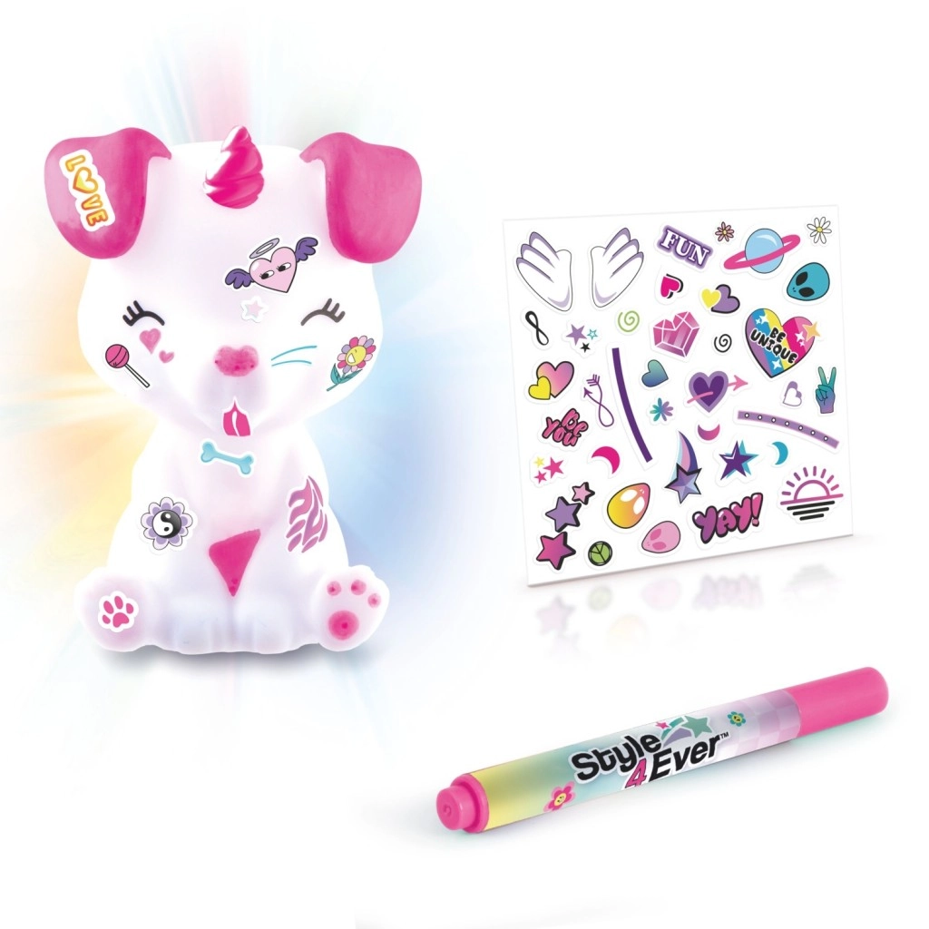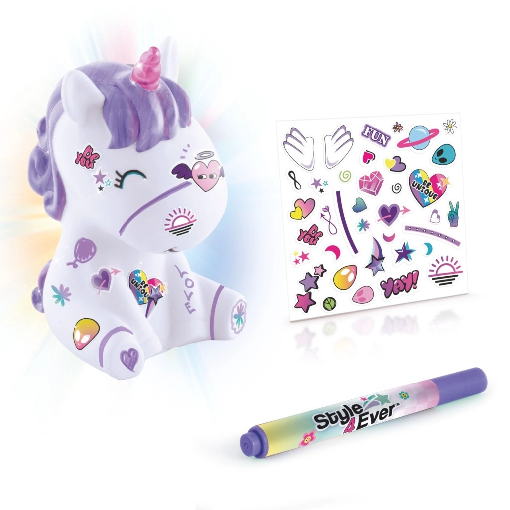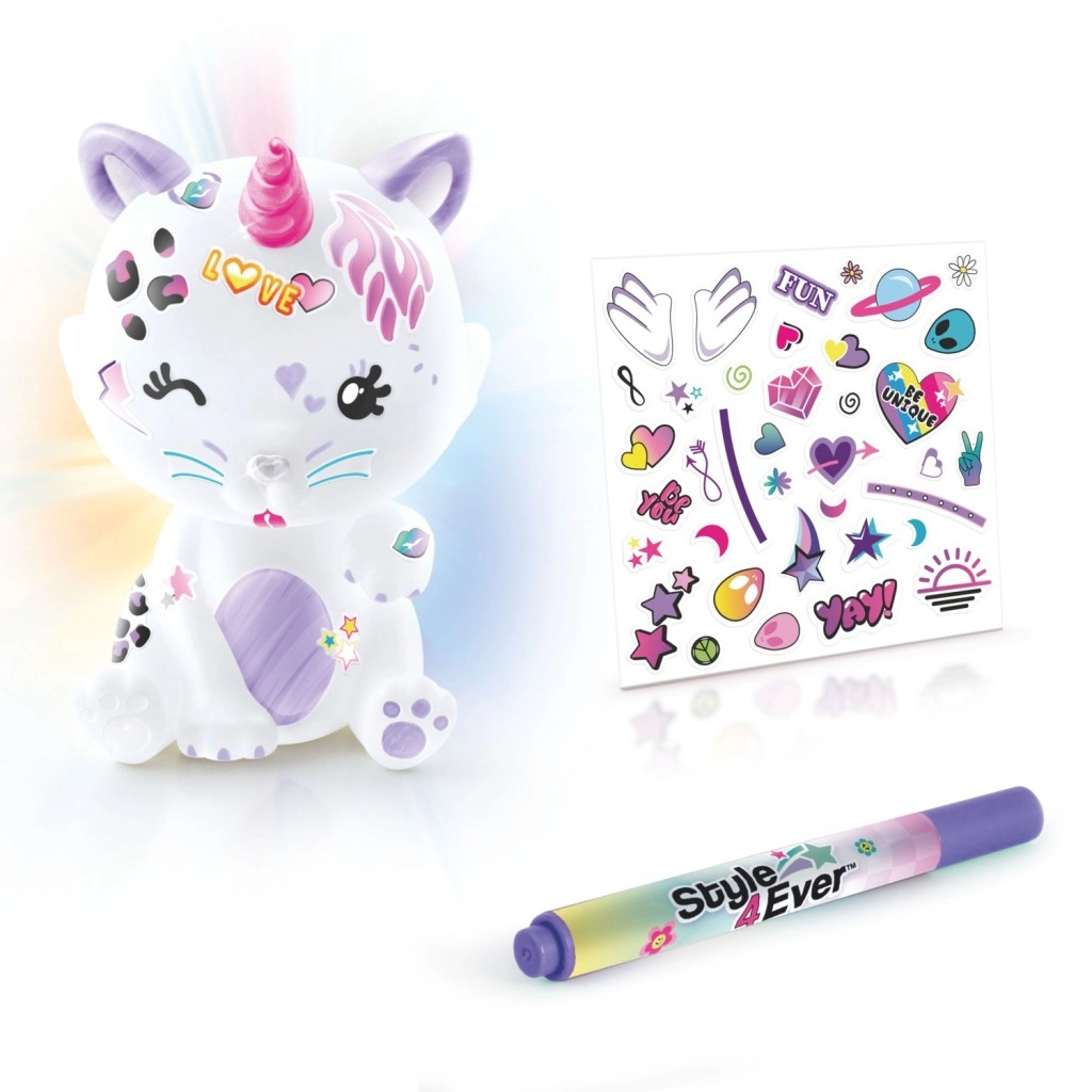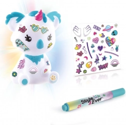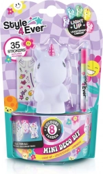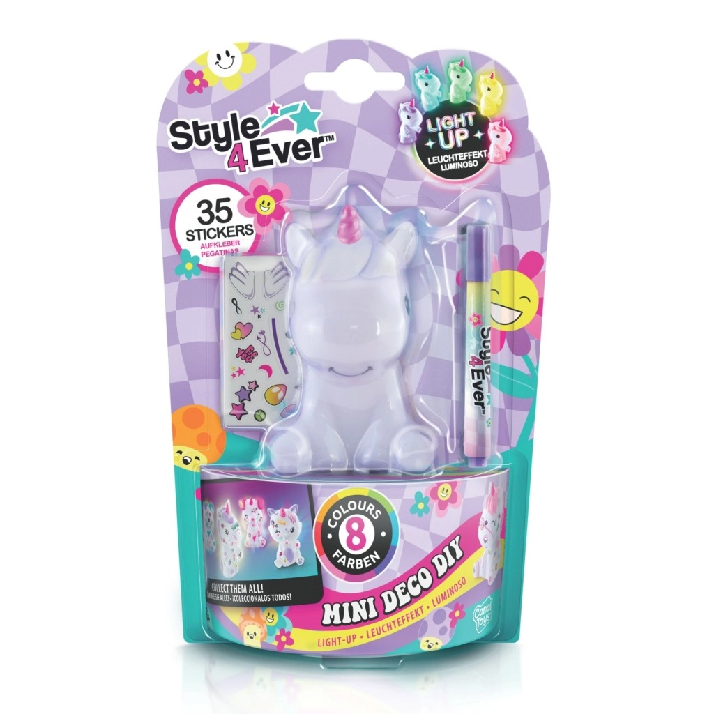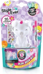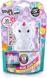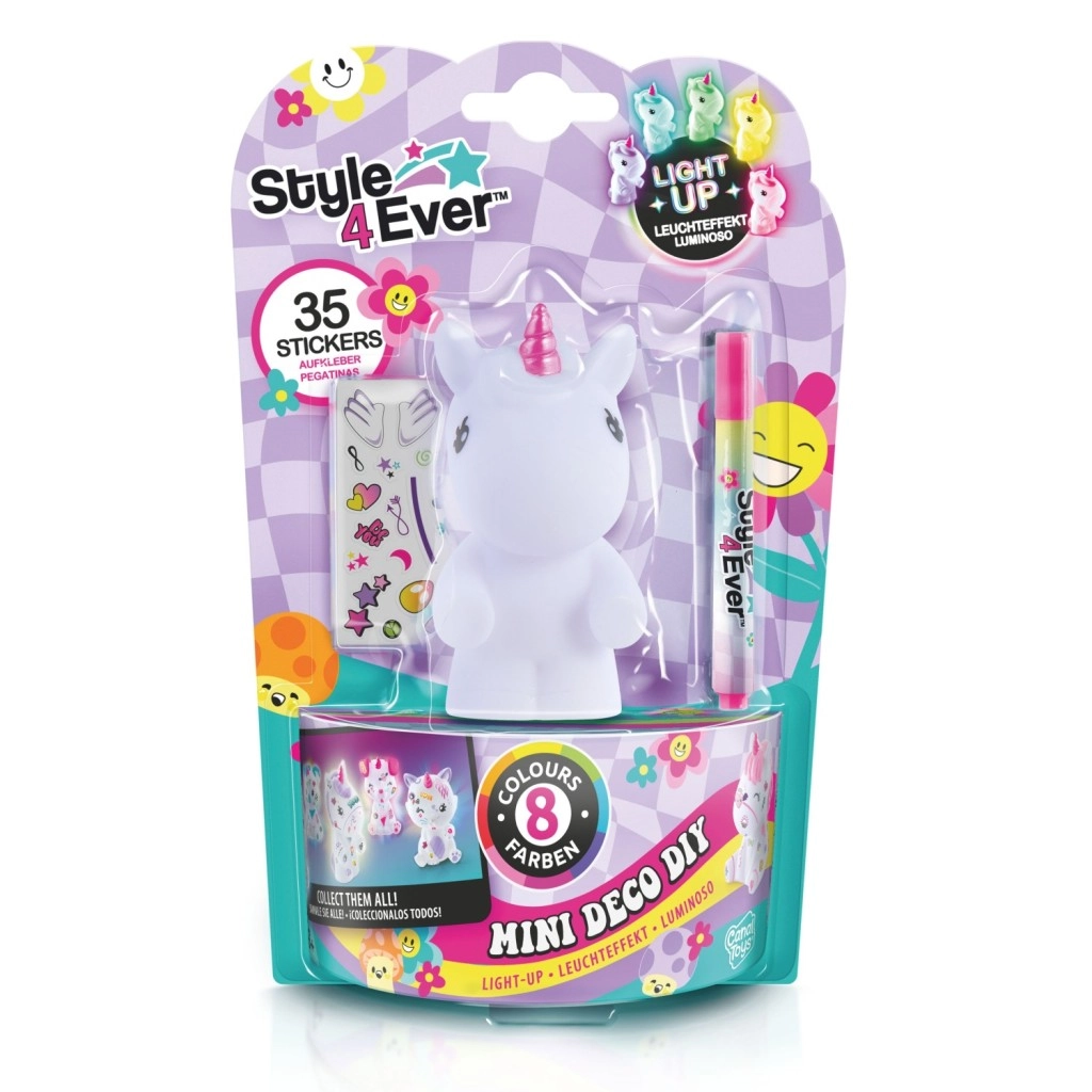 Osvijetlite sobu originalnom dekoracijom: svjetleća figurica STYLE4EVER mini deco donosi nježno ambijentalno svjetlo u 8 boja i prostor za kreativno ukrašavanje. U pakiranju se nalaze naljepnice i flomaster, a možete birati između 6 motiva (2 jednoroga, koala, pas, mačka). Baterije su uključene i igračka je prikladna od 6 godina.