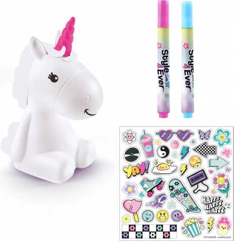 Nema potrebe za dodatnom opremom – sve potrebno je unutra. Jednorog svijetli u 8 različitih boja, a zahvaljujući priloženim flomasterima i naljepnicama lako ćete stvoriti originalan dizajn. Baterije 3× LR1130 (1,5 V) već su priložene, pa možete stvarati odmah nakon raspakiravanja.