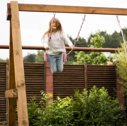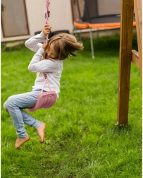 Stilska i sigurna dječja ljuljačka, idealna za vrt ili dom. Dizajnirana je tako da pruža stabilnost i udobnost zahvaljujući profiliranom sjedalu i čvrstim užadima.