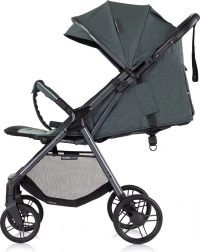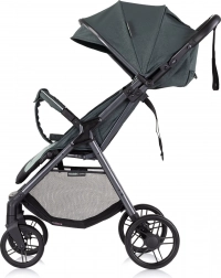 Za glatku vožnju brinu ovješena i brzo odvojiva kola sa stražnom spojnom kočnicom, dok djetetu udobnost osiguravaju podstavljeni 5-točkovni pojasevi, podesivi naslon za leđa i oslonac za noge te velika nadstrešnica s ventilacijskim prozorčićem, sunčanom sjenom i džepom za sitnice. Praktična velika košara prima kupovinu i sve potrebno za put.
