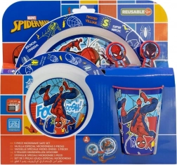 Petodijelni dječji set za jelo s omiljenim motivom SPIDERMAN marke STOR uljepšat će svaki obrok. Sadrži tanjur, zdjelicu, čašu, žličicu i vilicu, bez BPA, a za mikrovalnu je prikladna samo čaša (maks. 600 W na 2 minute).