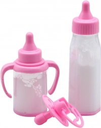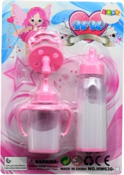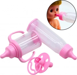 Sadrži dvije različite bočice i dud u nježnoj ružičastoj boji. Savršeno za igre uloga i simulaciju brige o lutkama.