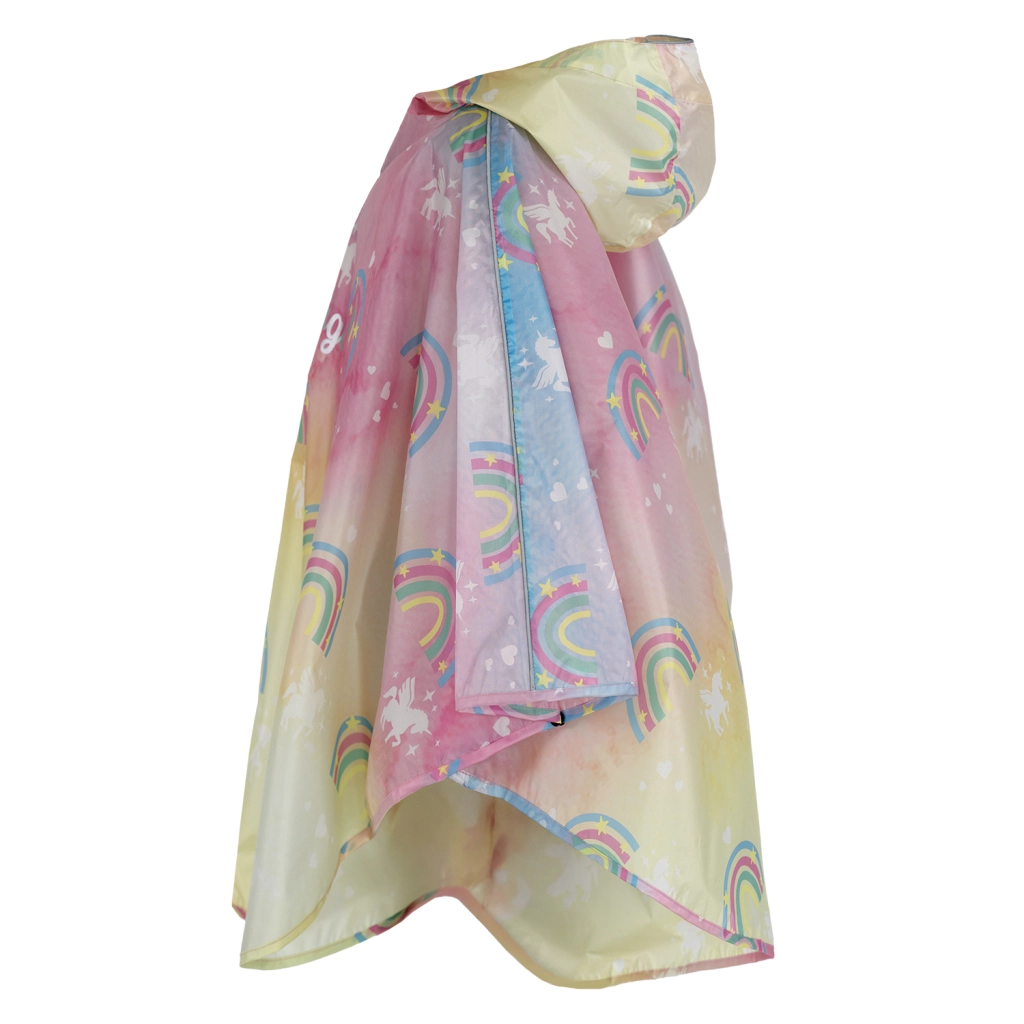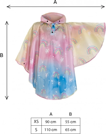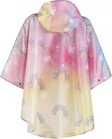 Stilski dječji kišni pončo s kapuljačom i šiltom u čarobnom dizajnu jednoroga i duge. Lagan vodonepropusan materijal, reflektirajući elementi za sigurnost i kroj preko ruksaka ili školske torbe čine ovu kabanicu idealnim izborom za školu i izlete. U pakiranju je praktična vrećica na zatezanje u usklađenom dizajnu.