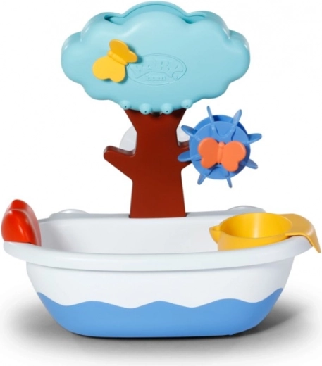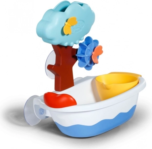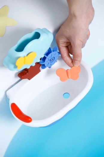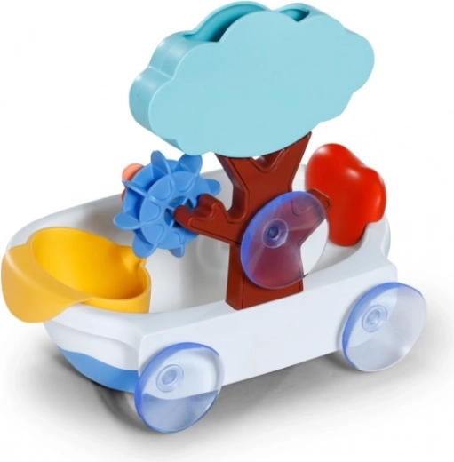 Ovaj razigrani set za kupanje pretvara svako pranje u zabavnu vodenu pustolovinu. Djeca mogu zahvaćati vodu u čašicu, ulijevati je u „stablasti” tuš i promatrati kako se vodeno kolo pokreće. Zahvaljujući vakuumskim čašicama, baza stabilno stoji na glatkoj površini kade ili pločica.