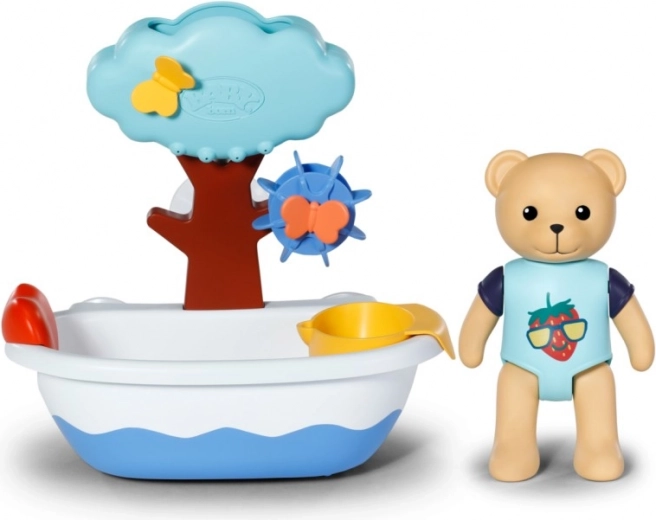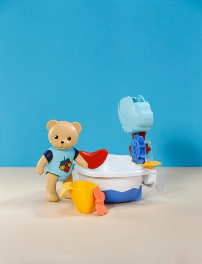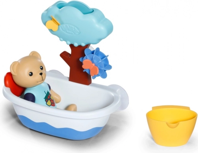 Uljepšajte djeci kupanje s preslatkom kadicom i medvjedićem Teddyjem. Interaktivni set nudi rotirajuće vodeno kolo, drvenu/“stablastu” tuš-kaskadu s oblakom, posudicu za lijevanje vode i vakuumske čašice za jednostavno pričvršćivanje na kadu ili stijenku tuša. Medvjedić visine 15 cm ima otiskan kupaći kostim i idealan je za male dječje ruke.