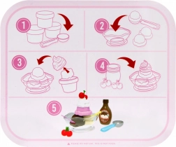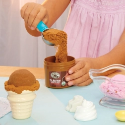 Sastavni dio je poseban modelirajući pijesak za lako oblikovanje kuglica, kartica s receptom za učenje postupaka korak po korak i bogata oprema dodataka za realističnu pripremu sladoleda u dječjoj kuhinjici.