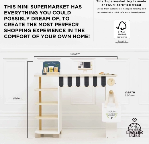 Stvorite djeci vlastitu trgovinu s prekrasnim drvenim štandom LE TOY VAN. Set uključuje blagajnu, pokretni trak, skener i bogat asortiman prehrambenog pribora za realističnu igru kupovine. Izrađeno od FSC drva i prirodnog pamuka, 100% bez plastike, sigurno i izdržljivo za svakodnevnu igru.