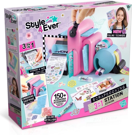 Kreativni studio 3u1 STYLE 4 EVER je multifunkcionalni likovni set za djecu od 6 godina koji spaja tri omiljene tehnike – izradu naljepnica, embossiranje i izradu/dekoriranje washi traka. Ručni stroj u pastelnim bojama lako se koristi pomoću okretnog kotačića i omogućuje stvaranje plastičnih uzoraka, originalnih naljepnica i personalizirano ukrašavanje dnevnika.