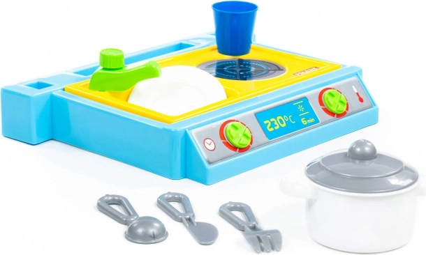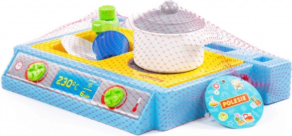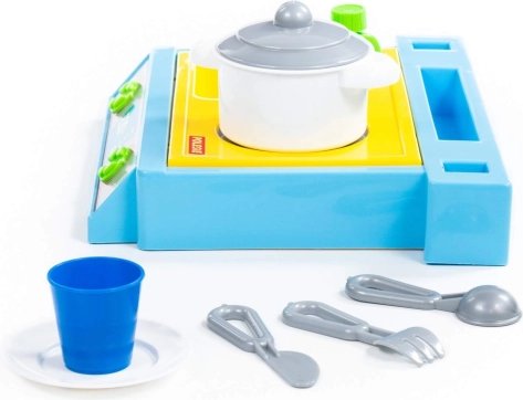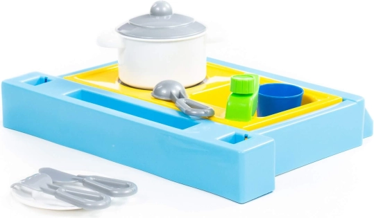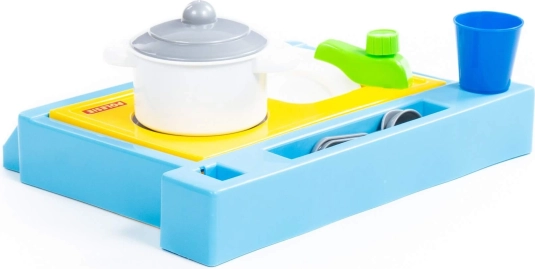 Mali stolni set koji sadrži sudoper, ploču za kuhanje i set posuđa