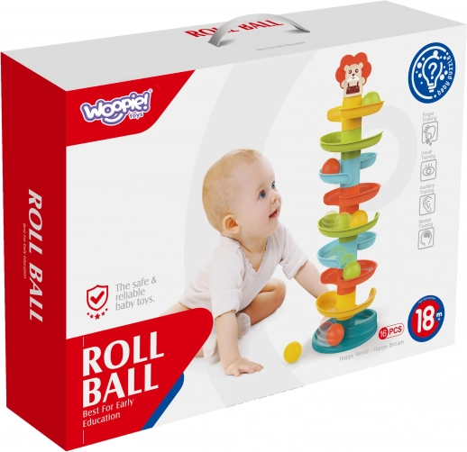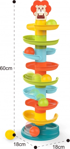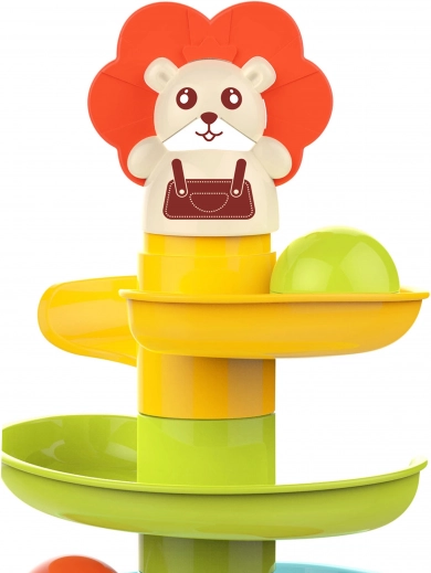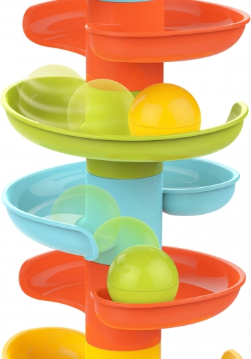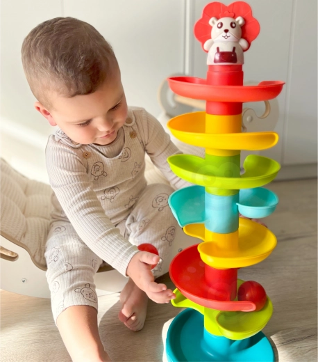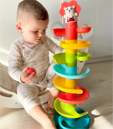 Složite raznobojni spiralni toranj i promatrajte kako se kuglice kotrljaju niz razine. Dijelovi kulodroma lako se klikaju, pa djeca mogu graditi iznova i iznova, vježbati strpljenje i kreativnost. Svaka od 6 šarenih kuglica pri kretanju ugodno zvecká, čime potiče osjetila i produljuje vrijeme igre.