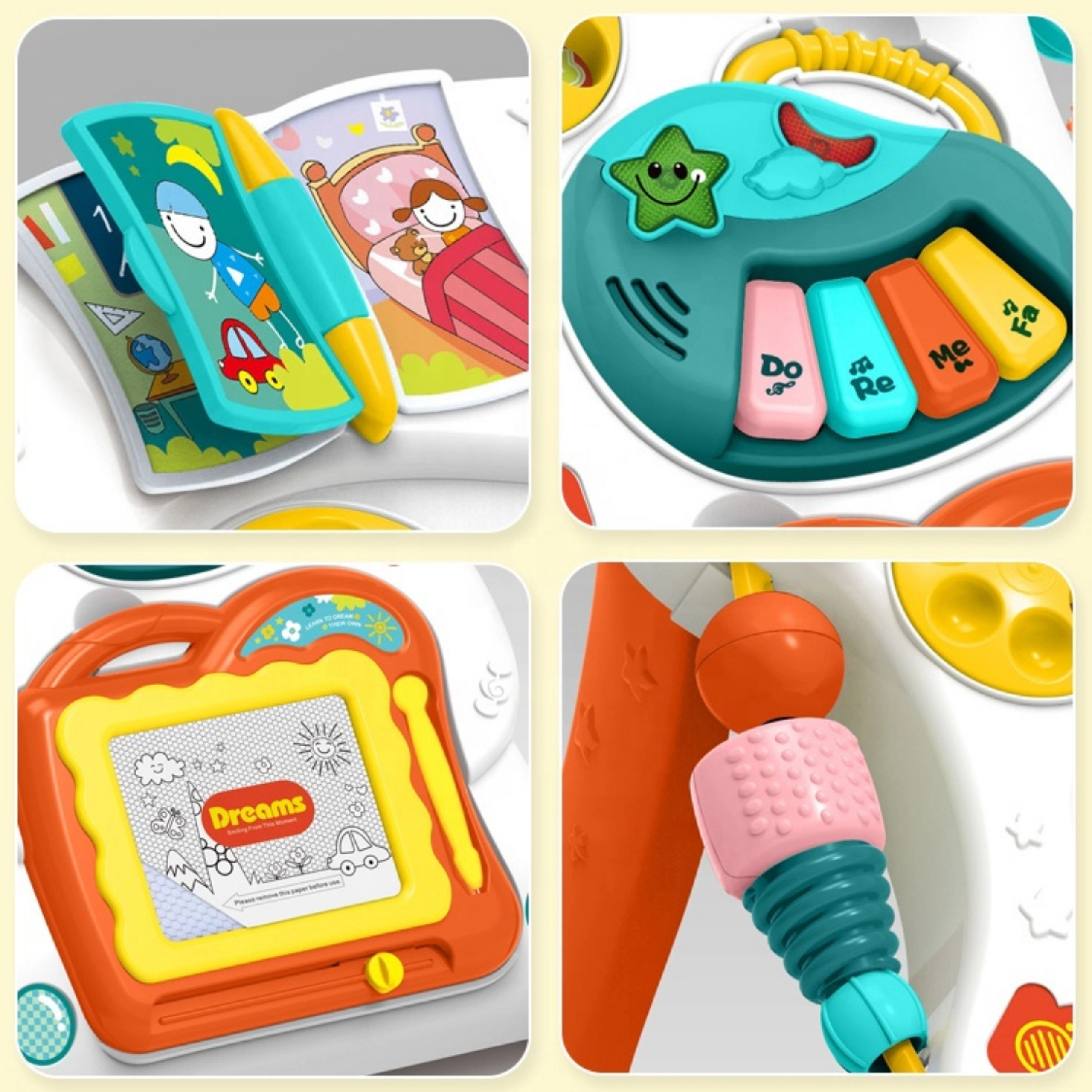 Dio seta je znikopis (magnetna ploča za crtanje) za beskrajno crtanje bez nereda, klavijatura s melodijama, sigurno ogledalce, šarena knjižica i odvojivi telefon koji može funkcionirati i kao zasebna igračka. Košara i 3 loptice pozivaju na dodatne igre i vježbanje koordinacije.