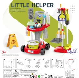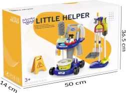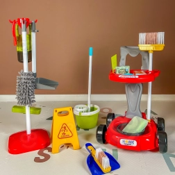 U kompletu je sve potrebno: kolica na kotačima, mop, metla i ručna metlica s lopaticom, kanta, raspršivač, krpice, upozoravajuća tabla „Oprez, sklizak pod“ i drugi dodaci. Broj elemenata pruža djeci sate zabave i potiče igranje uloga te suradnju sa sestrom ili bratom.