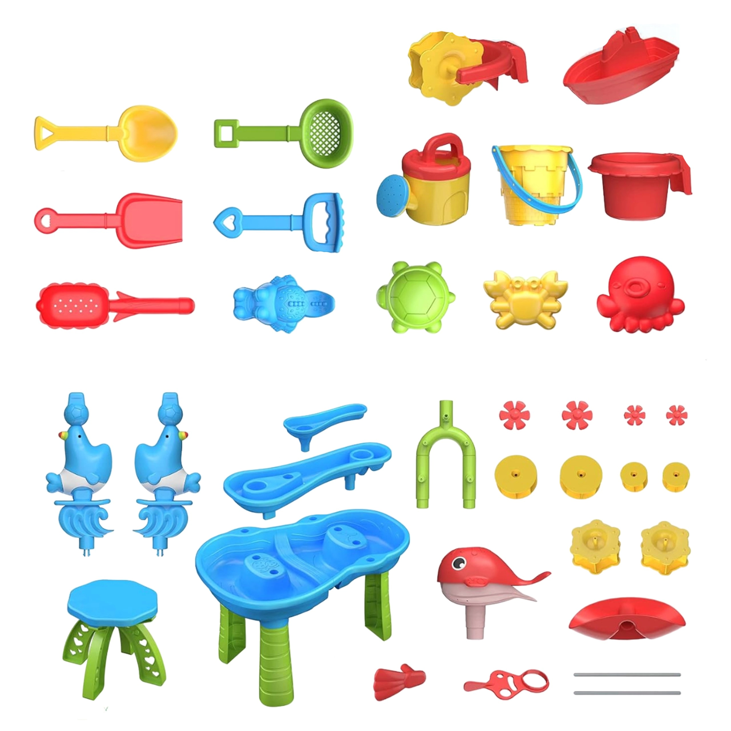 - Pribor od 37 dijelova: kante, zalijevača, kalupi, lopatica, grabljice, sito i drugo.