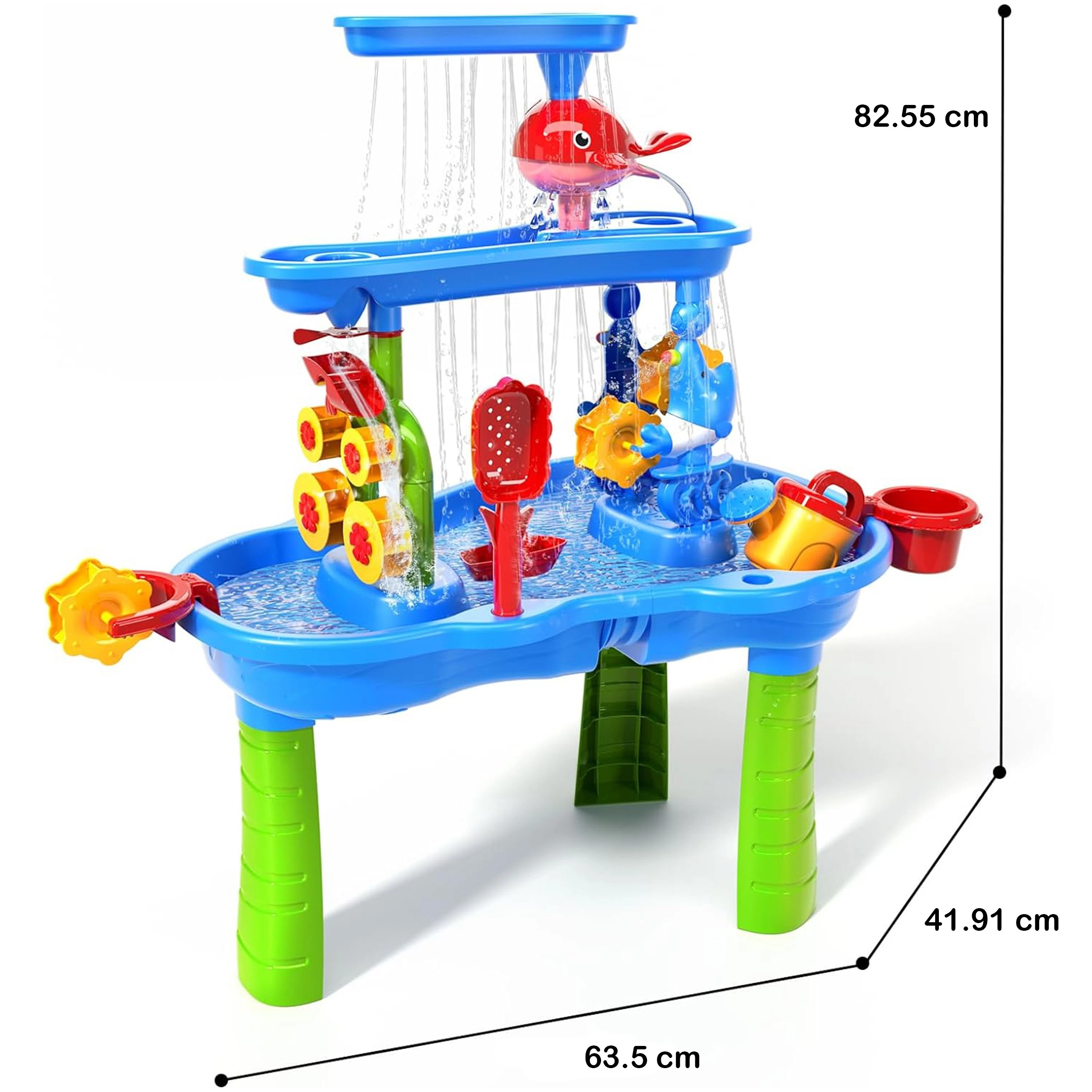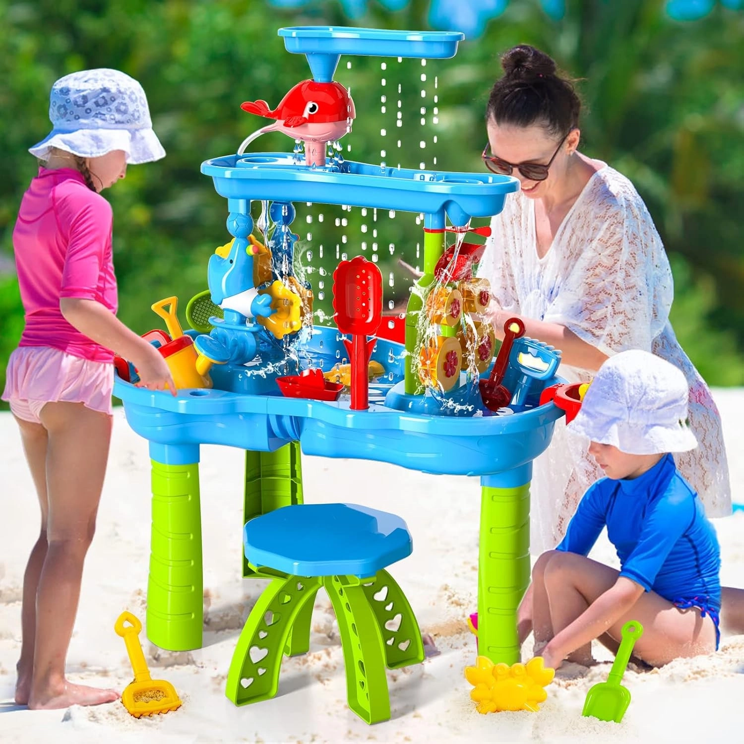 WOOPIE XL stol za vodu i pijesak donosi djeci cjelogodišnju zabavu – ljeti osvježavajuće vodene atrakcije, u hladnijem razdoblju stvaranje s pijeskom ili kinetičkim pijeskom. Zahvaljujući trostupanjskom kaskadnom sustavu djeca ulijevaju vodu u gornji spremnik i promatraju kako tok pokreće vodene kotače i mlince te teče u donje posudice. Dio seta su i stolac te širok izbor alata za igru i eksperimente.