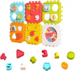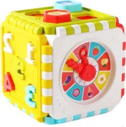 Kocka je puna raznolikih aktivnosti poput satova s pomičnim kazaljkama i sortiranja oblika, koje podržavaju dječje učenje.
