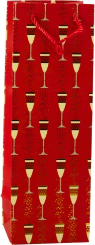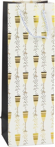 Stilizirana poklon-vrećica za bocu od čvrstog papira idealna je za darivanje vina ili pjenušca. Nudi elegantan izgled, čvrstu konstrukciju i sigurno prenošenje zahvaljujući užetnim ručkama i ojačanom dnu. Motiv sa zlatnim akcentom i izbor od četiri boje savršeno pristaju slavljima i posebnim prilikama.