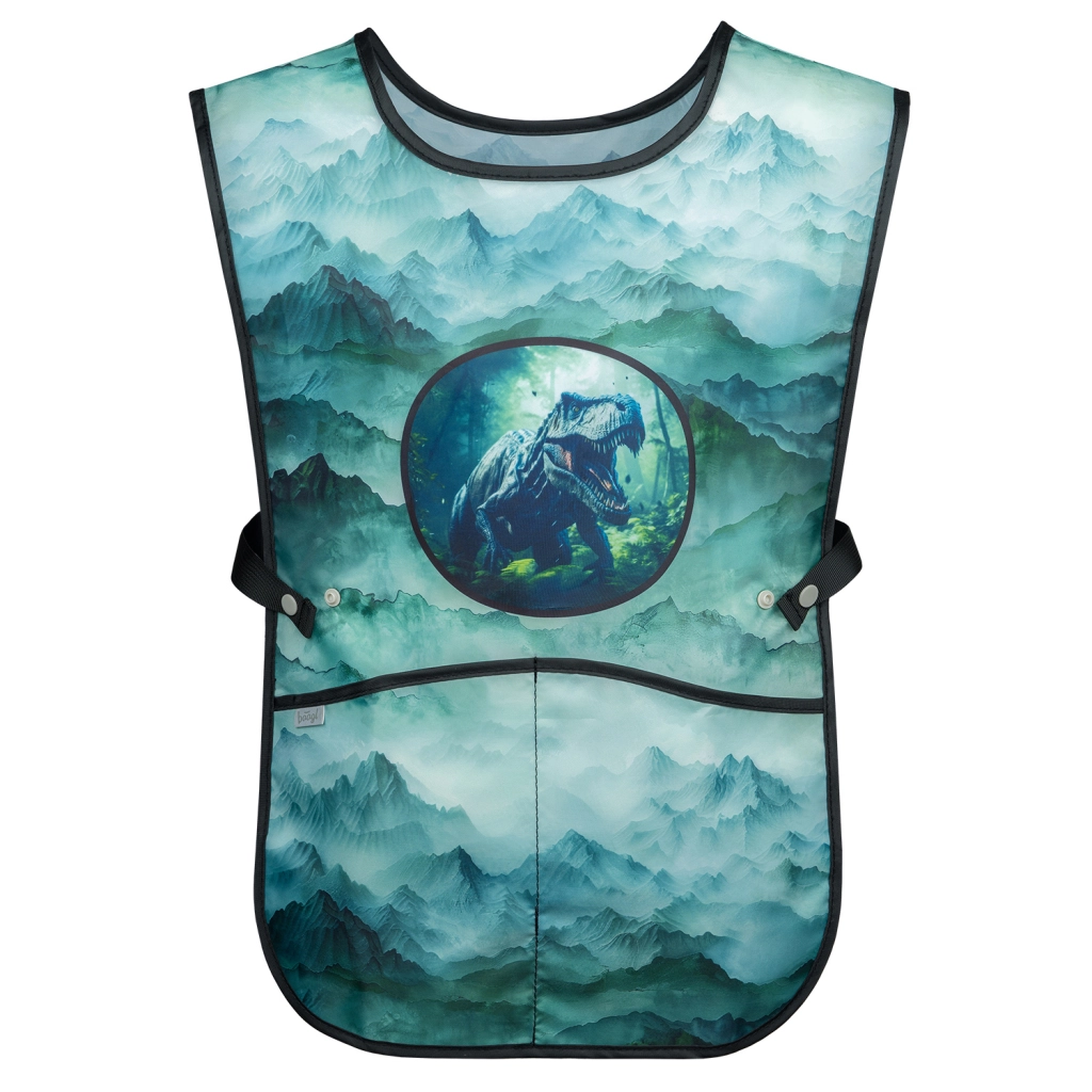 Dječja pregača DINO praktična je pregača za likovni odgoj ili radne aktivnosti, opremljena s dva džepa.