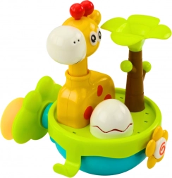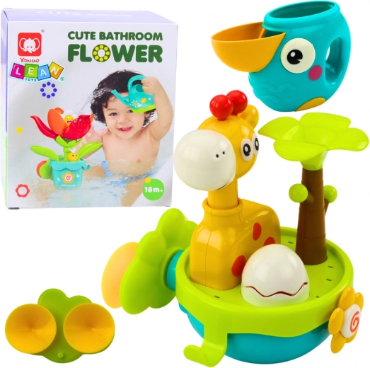 Set sadrži slatku žirafu s pokretnim dijelovima, šarenu palmu, cvjetove i šarene vodene rotore. Uključuje i praktičnu čašu s izljevom kojom se igračka može polijevati vodom. Kada dijete ulije vodu na označena mjesta, igračka oživljava - počinju se okretati dijelovi, cvjetovi se pomiču, a voda teče, što privlači pažnju i donosi puno radosti.