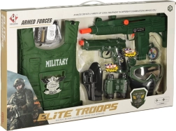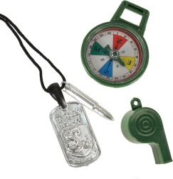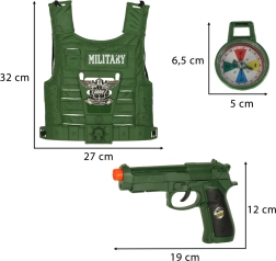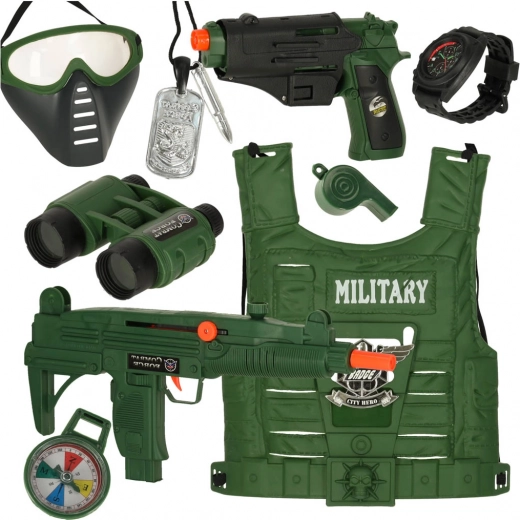 Ovaj vojni set idealan je za sve male ljubitelje avanture i vojnih igara. S ovim setom djeca mogu doživjeti uzbudljive misije i avanture. Uključuje: prsluk, dalekozor, pušku s mehaničkim punjenjem, baterijski pištolj, silikonski sat, masku za oči, kompas, stvarnu zviždaljku, vojnu identifikacijsku oznaku i futrolu za pištolj. Svaki element izrađen je od visokokvalitetnih materijala i nudi realistične detalje.