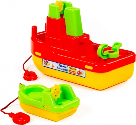Tegljač je opremljen kukom i užetom zahvaljujući kojima djeca lako mogu priključiti i vući manji brodić – baš kao na pravoj vodi.