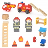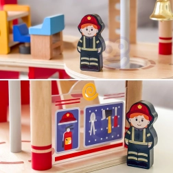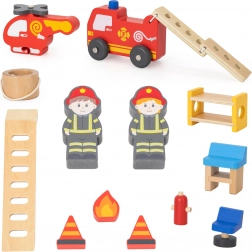 U pakiranju se nalazi sve što je potrebno za napetu igru: vatrogasno vozilo, helikopter s posudom za vodu, 2 figurice vatrogasaca, plamen za „gašenje“, prometni čunjevi, vatrogasni aparat i namještaj (krevet, stol, stolac). Kvalitetno drvo, glatki rubovi i žive boje osiguravaju sigurnu i dugotrajnu igru.