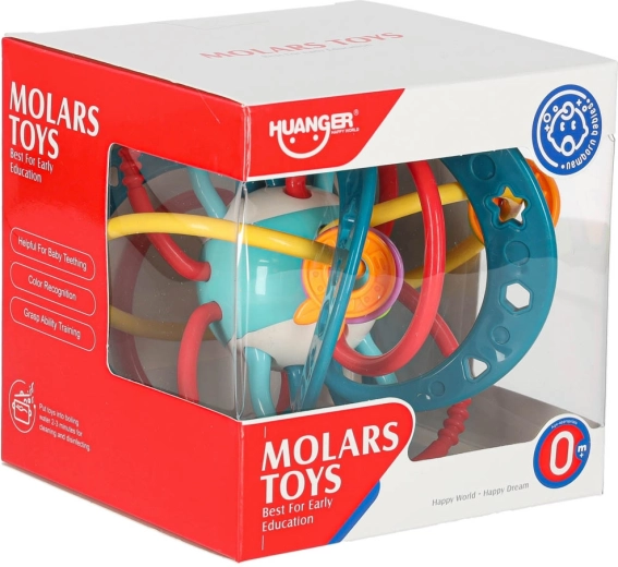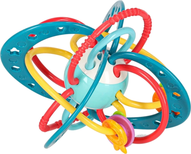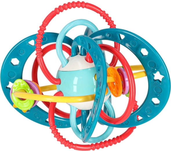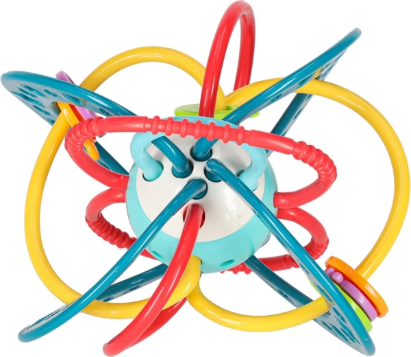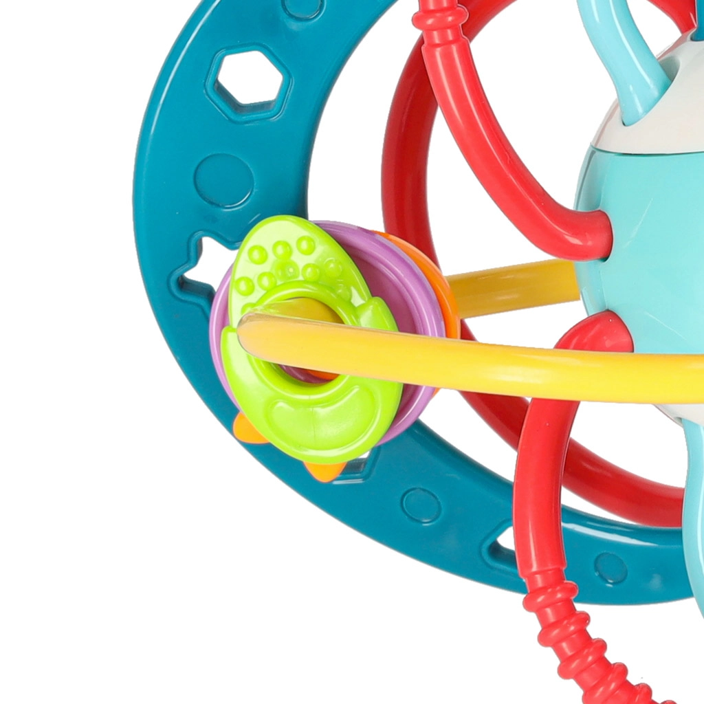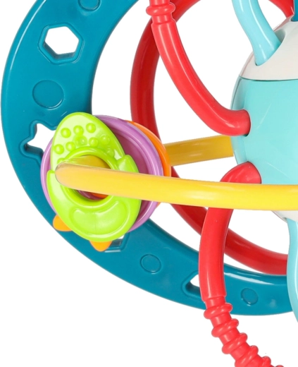 Ovo tirkizno grizalo–zvečka dizajnirano je za najmanje ručice. Ispreplicane omčice i prstenovi lako se drže, različite površine masiraju desni a šareni elementi privlače pažnju. Trešenjem dijete aktivira nježno zveckanje koje potiče senzorni razvoj.