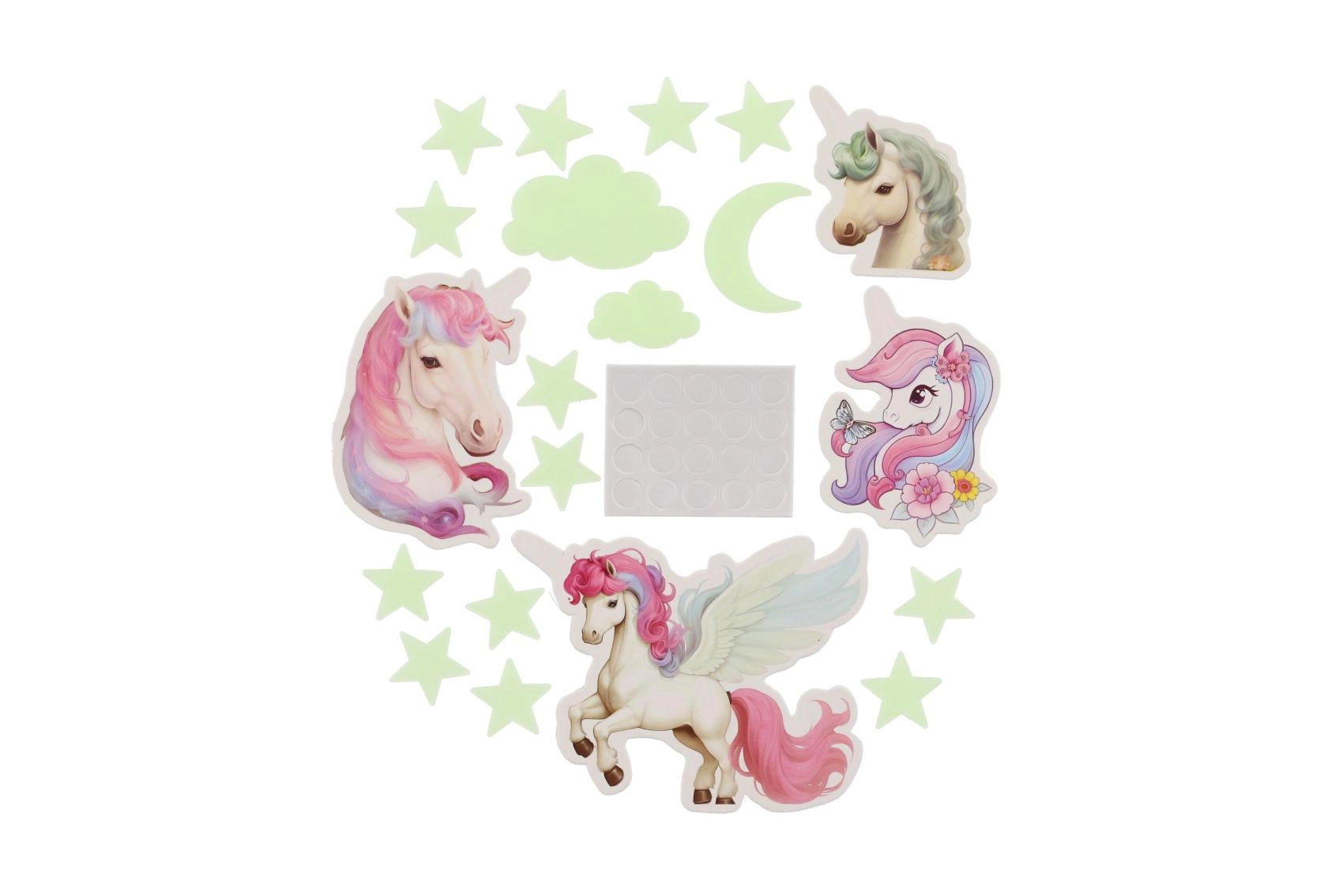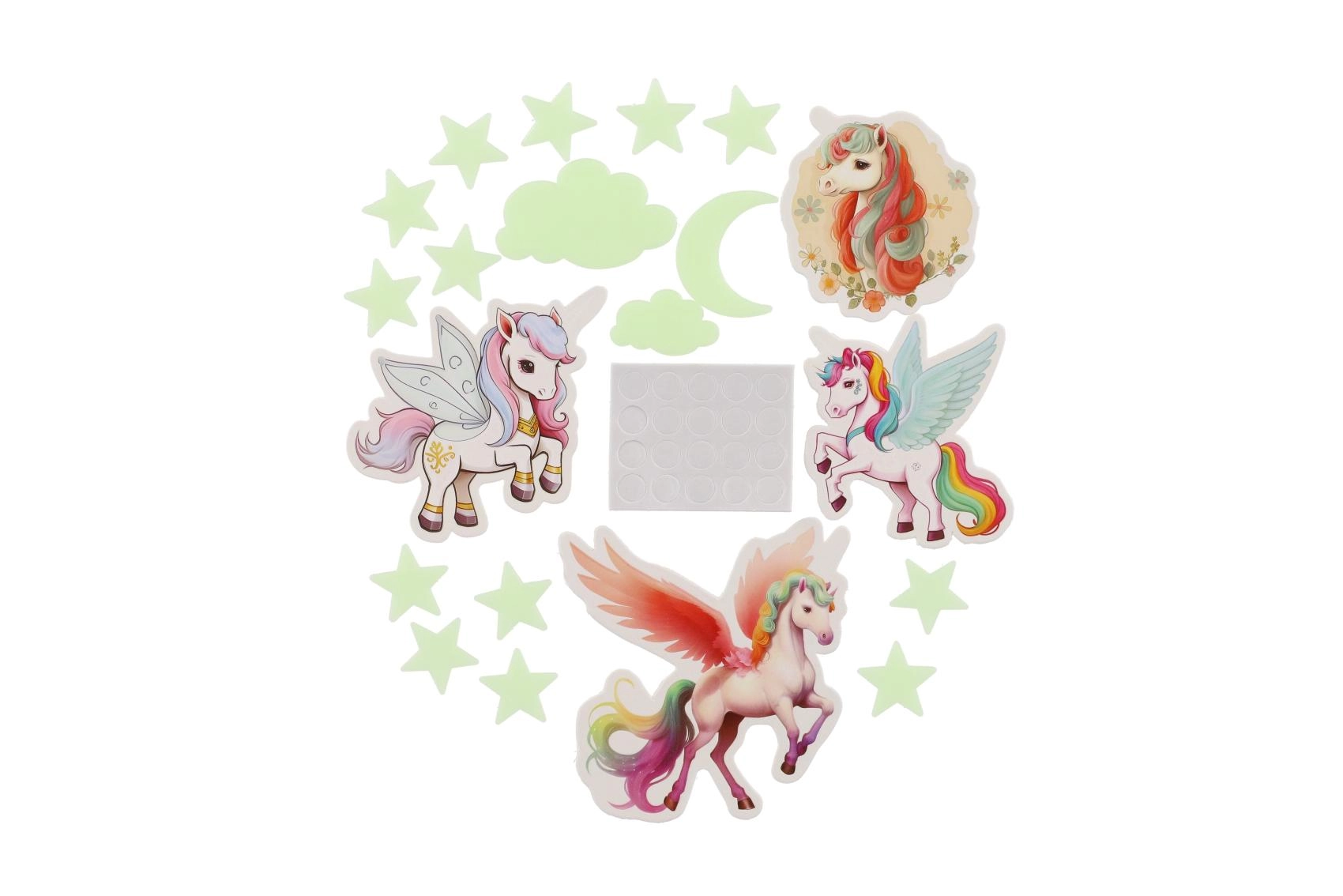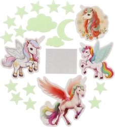 Stvorite djeci čaroban svijet izravno u njihovoj sobi. Svjetleći jednorog nakon izlaganja svjetlu zasja i stvara nježnu svjetlost koja umiruje i pomaže pri uspavljivanju. Set sadrži različite oblike i veličine jednoroga za kreativno ukrašavanje zidova i stropa.