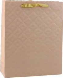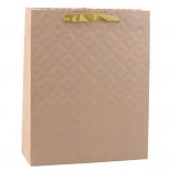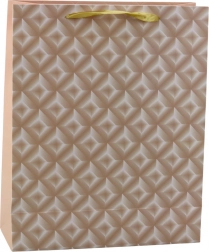 Poklon-vrećica je izrađena od visokokvalitetnog ojačanog papira, a njezinu površinu krasi reljefni geometrijski uzorak koji prekrasno reflektira svjetlo. Dvije varijante prednje i stražnje strane osiguravaju da vrećica izgleda stilski iz svakog kuta. Satenaste ručke u svijetloj nijansi daju cijeloj kompoziciji nježan karakter i jamče udobno nošenje.