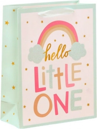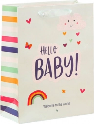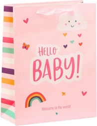 Ova poklon-vrećica za djecu s pastelnim dizajnom idealna je za darivanje povodom rođenja djeteta, baby showera ili prvog rođendana. Ukrašena slatkim motivima s natpisima „Hello Baby” i „Hello Little One”, ova vrećica donosi radost i toplinu svakom svečanom danu.