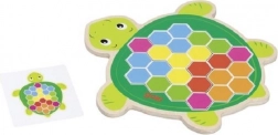 Upoznajte Drvenu slagalicu kornjača od Goki, koja nudi pedagoške i didaktičke izazove za male i velike igrače. Vaš zadatak je slagati dijelove prema karticama sa šablonama, u jednostavnijoj šarenoj verziji ili složenijoj verziji na plavoj strani kartica.