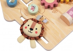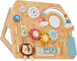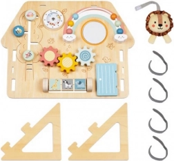 Aktivna ploča u obliku kućice s motivom lavljaka stimulira osjetilno opažanje djece zahvaljujući blagim bojama, simpatičnim slikama i različitim teksturama površina. Djeca vole aktivnosti kao što su labirint s kuglicama, rotirajuće i klizne pločice sa slikama životinja. Ova ploča za igru također potiče koordinaciju ruka-oko i maštu.