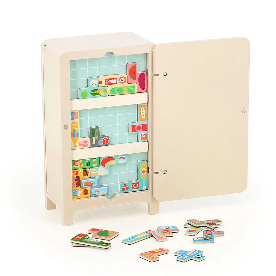 Igra s dizajnom Ingele P. Arrhenius uključuje drveni hladnjak, dvije magnetske police i 21 magnetsku namirnicu. Djeca mogu stvarati vlastiti raspored hladnjaka, što potiče njihovu kreativnost i sposobnost rješavanja problema. Priložena brošura s uputama nudi 7 različitih rješenja.