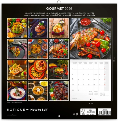 Kalendar Gourmet 2026 donosi ne samo prekrasne fotografije jela, već i praktične funkcije. Sadrži šestojezični kalendarij koji je pogodan za svakoga. Pronaći ćete mjesečeve mijene, važne blagdane i prostor za vaše bilješke, što će vam omogućiti bolju organizaciju vremena.