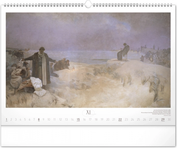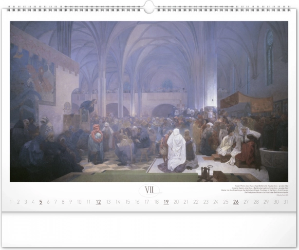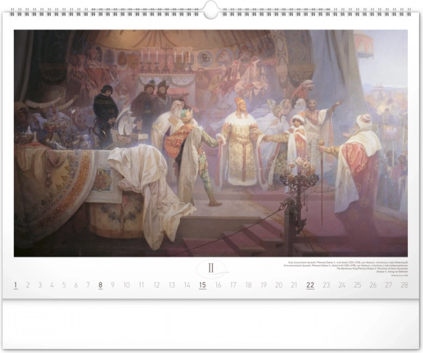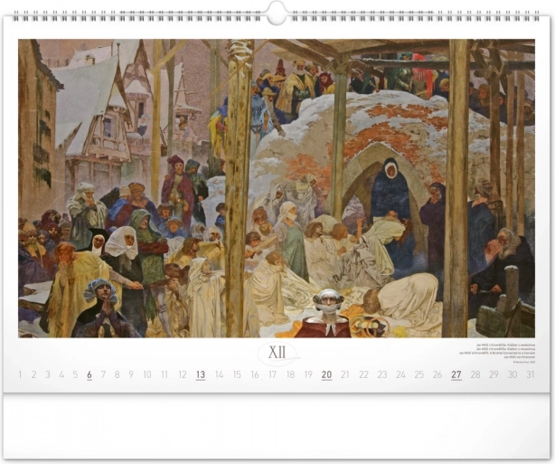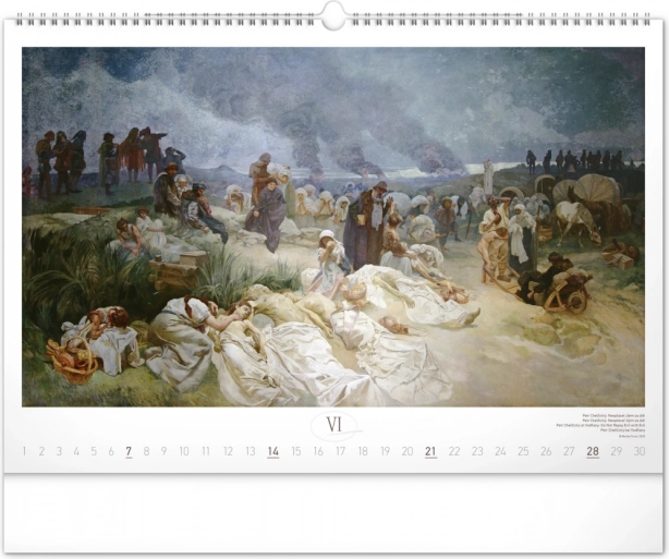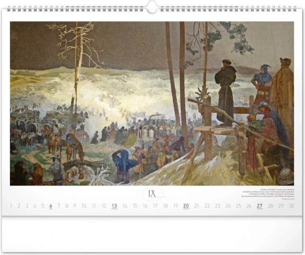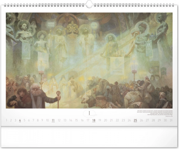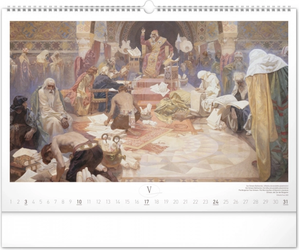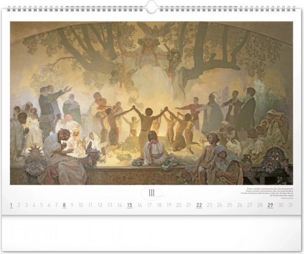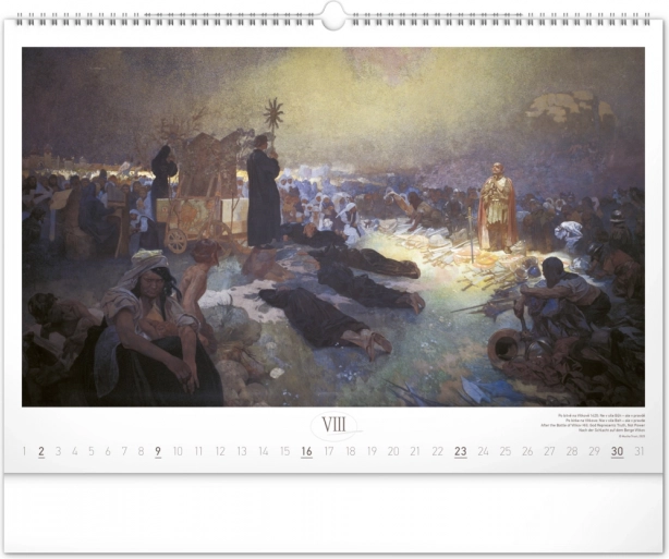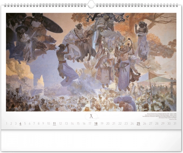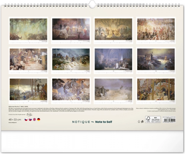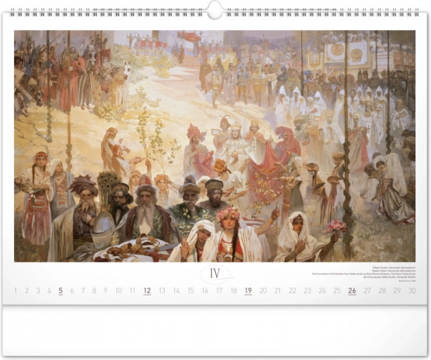 Zidni kalendar s reprodukcijama remek-djela Alfonsa Muche iz serije Slavenska epopeja, idealan za ljubitelje umjetnosti i povijesti.