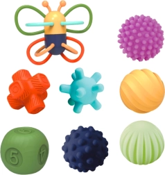 U setu se nalaze meke loptice s izbočinama, fleksibilne grizalice zanimljivih oblika, elementi za stiskanje te i zvečkica lagane i praktične konstrukcije, koja djetetu privlači pažnju zvukom i oblikom. Svi su dijelovi izrađeni od visokokvalitetnih, netoksičnih materijala sigurnih za djecu – pogodnih za žvakanje, stiskanje i istraživanje ustima ili ručicama. Površine su blage prema koži, a veličina elemenata idealno je prilagođena dječjim ručicama.