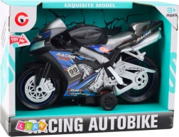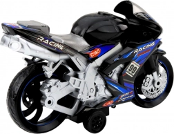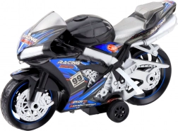 Crno-plavi motocikl izrađen je od izdržljive plastike otporne na oštećenja, te je opremljen snažnim kotačima za sigurnu vožnju po raznim površinama. Pritiskom na gumb aktiviraju se zvučni i svjetlosni efekti – realistični zvukovi motora i svjetlosni spektakl osiguravaju nezaboravno iskustvo.