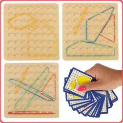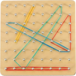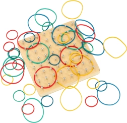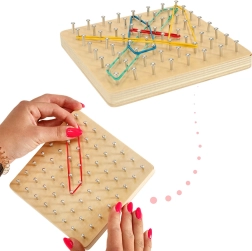 Otkrijte zabavan način kako djecu upoznati s osnovama matematike – oblicima, kutovima i simetrijom. Na drvenoj ploči s gustom mrežom klinova djeca rastežu gumice različitih duljina i boja te stvaraju oblike prema kartama ili vlastitoj mašti. Igra jača koordinaciju oko–ruka, koncentraciju i logičko razmišljanje.