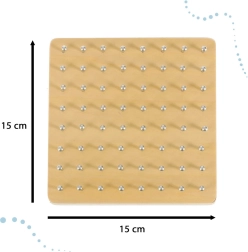 Ploča je izrađena od glatko brušenog drva bez oštrih rubova. Metalni klinovi imaju zaobljene završetke koji štite od ogrebotina i pomažu zadržati gumice na mjestu. Zahvaljujući kompaktnim dimenzijama geoboard je prikladan i za dom i za putovanja.