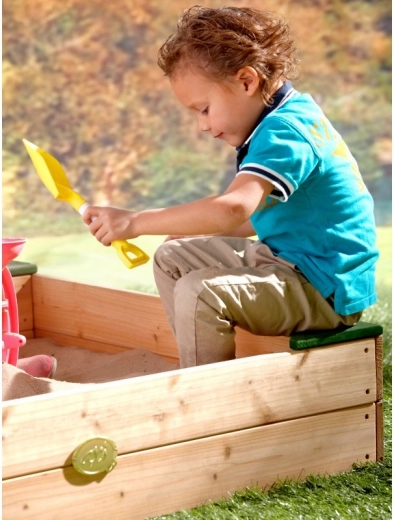 - Spremište: Djeca mogu odlagati svoje lopatice i kantice u spremište s drvenim poklopcima, koji mogu poslužiti i kao klupice.