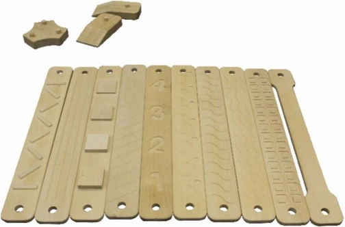 Ploče imaju različite uzorke pa djeca mogu dodatno potaknuti osjet dodira. Hodanje bosonoga po pločama dodaje još jednu dimenziju zabave. Set sadrži 10 različitih ploča i komponente za jednostavnu montažu za povišenje.