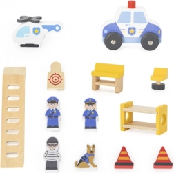 Dio seta je bogat pribor: figurice 2 policajca, lopova i policijskog psa, zatim policijsko vozilo, helikopter i dodaci za organizaciju intervencije. Djeca prirodno vježbaju socijalne vještine, suradnju, koordinacijske sposobnosti i razvijaju maštu.