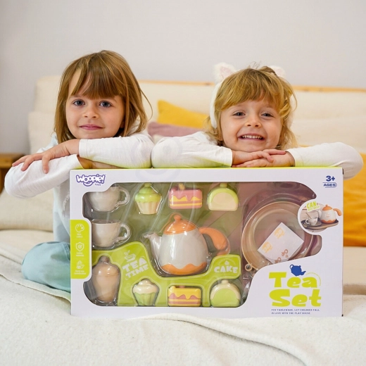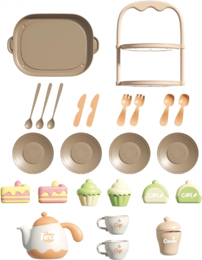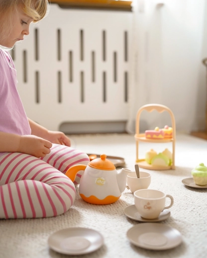 Čajnik, šalice, tanjurići, pladanj i stalak za deserte – djeca mogu točiti čaj i poslužiti slastice kao na pravoj gozbi.