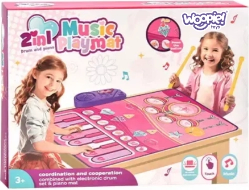 Interaktivna glazbena podloga 2u1 brenda WOOPIE pretvara svaku sobu u mali studio. Djeca od 3 godine mogu svirati klavir i bubnjeve, snimati vlastite skladbe, vježbati ritam te razvijati motoriku, sluh i kreativnost. Podloga je sklopiva i lako prenosiva te nudi podešavanje glasnoće i do 8 zvukova instrumenata.