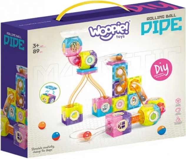 Otkrijte svijet stvaranja s magnetskim setom WOOPIE – kugličnom stazom s 89 dijelova. Prozirni blokovi, cijevi, zavoji i magnetski konektori omogućuju djeci gradnju stabilnih i šarenih staza niz koje se kotrljaju metalne kuglice. Sjajna igračka od 3 godine za razvoj kreativnosti, logike i fine motorike.
