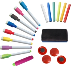U kompletu je 8 flomastera, 6 obojenih kreda, spužvica/krpica i 4 magneta – sve potrebno za odmah crtati, pisati i pričvrstiti bilješke.