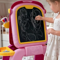 Obostrana ploča WOOPIE pruža djeci zabavan i edukativan prostor za crtanje, pisanje i prva školska vježbanja. Jedna strana je bijela i suho-brisiva za pisanje markerima, druga strana je kredna za klasično crtanje kredama. Zahvaljujući stabilnoj bazi i bočnim pretincima djeca imaju sve pri ruci i mogu se u potpunosti usredotočiti na stvaranje.
