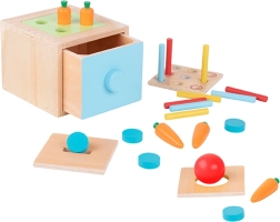 - - Sadrži 26 dijelova: ladica, 4 umetka za razvrstavanje, 1 crvena loptica, 5 novčića, 5 mrkvica, 9 štapića u tri boje